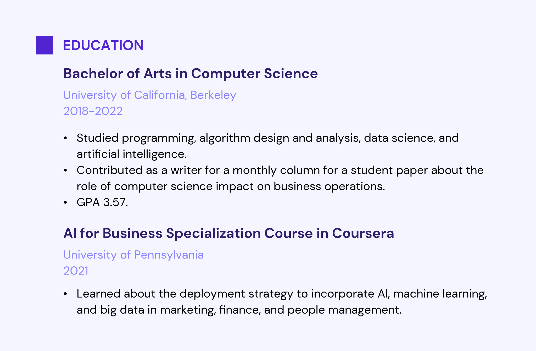 Take a look at the examples of an education section below and see which one is more suitable for an entry-level web developer resume template: