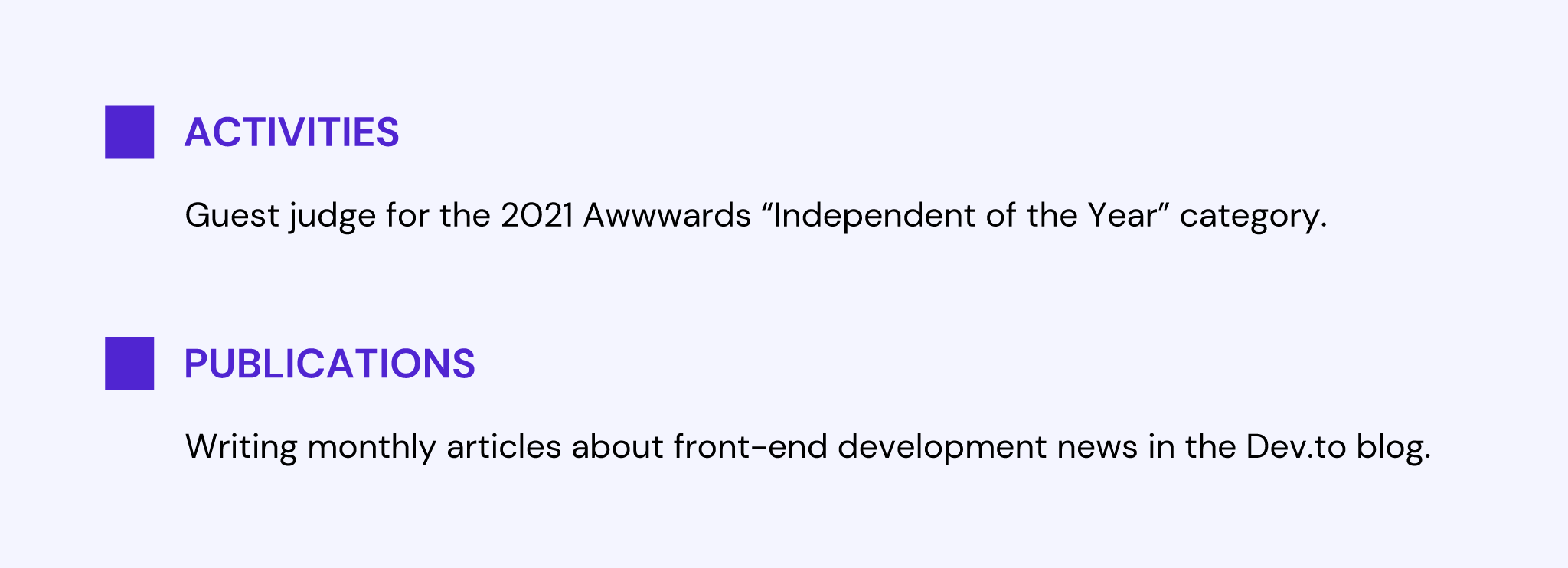 It’s best to take your time and effort to work on new projects. That way, you can list web development-related accomplishments that interest a hiring manager.