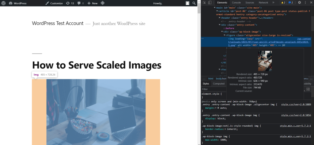 The DevTools panel will show up on the right side of the browser window. There, the image code will be highlighted. Hover over the code to see the image’s Rendered size and Intrinsic size.