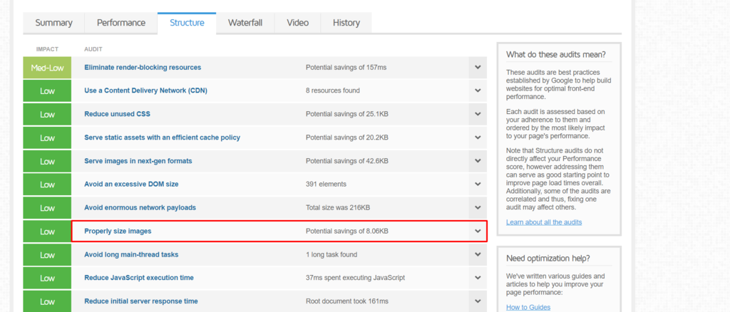 Once it finishes analyzing your site, go to the Structure tab and click the Properly size images section.