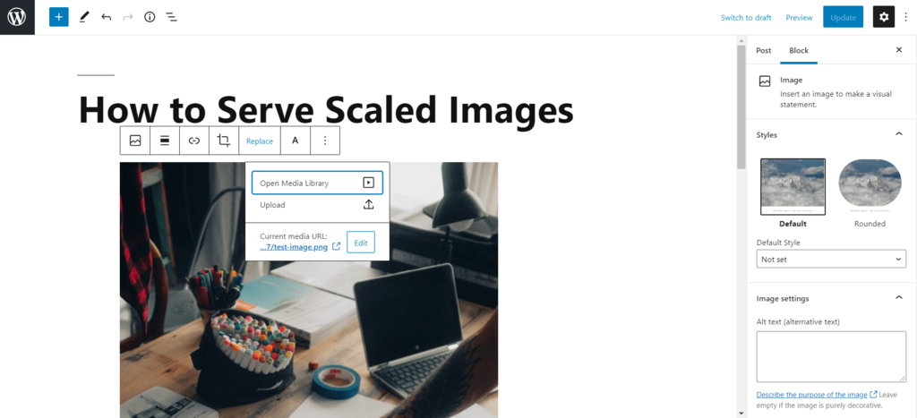 On the post, click the image you want to scale. Select Replace -> Open Media Library.