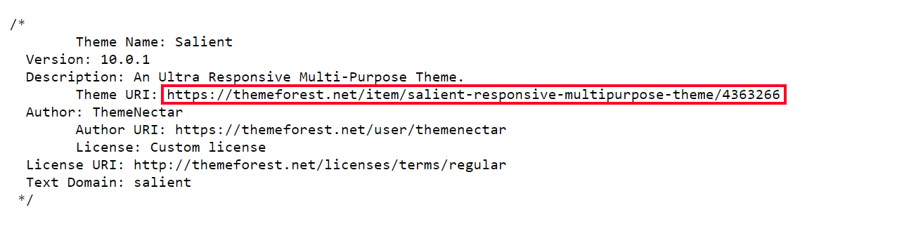 Next, click on the URL to view the style.css file. The theme header block at the top of the file will display the theme details. In addition to its name, it includes the theme version, author, and URI, which is the URL of the page where you can find more information about the theme.