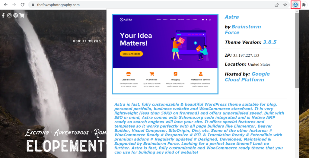 Alternatively, you can use a browser extension like WordPress Theme Detector and Plugins Detector. This is a convenient way to determine what theme a WordPress website is using, as there’s no need to leave the page.