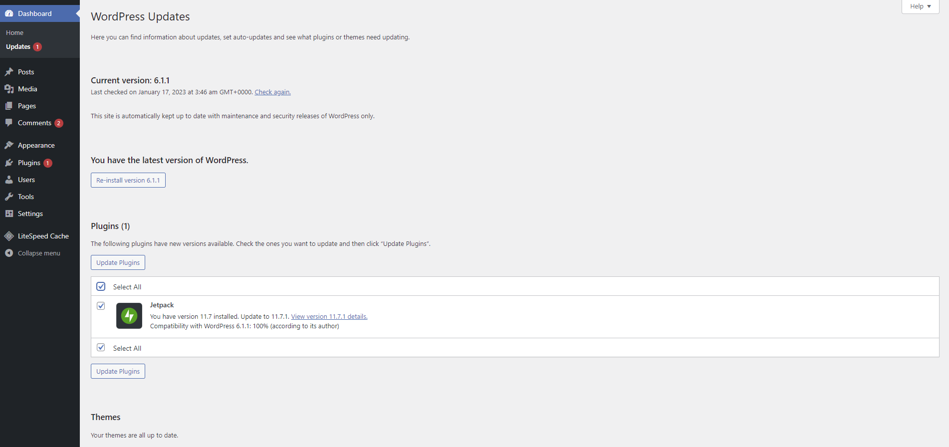 As for WordPress themes and plugins, you can find the ones with the latest patches on the Updates page from the admin dashboard. Check the Select All box and click Update Plugins to update all plugins. Follow the same steps to update your WordPress themes.