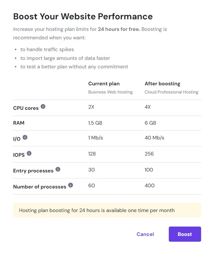 Both Hostinger and Wix offer unlimited bandwidth, but Hostinger has an edge with a free 24-hour resource boost feature. This lets websites handle upcoming traffic spikes, offering a glimpse into a higher-tier plan’s capabilities.