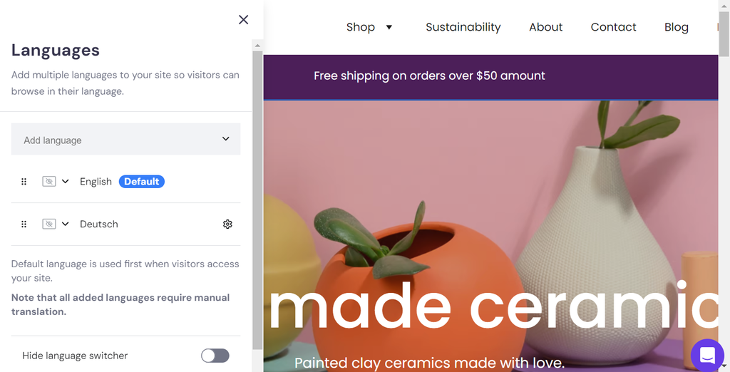 To create a multilingual website, click on the Languages button on the sidebar. Here, you can manually add language versions and input translations to the site.