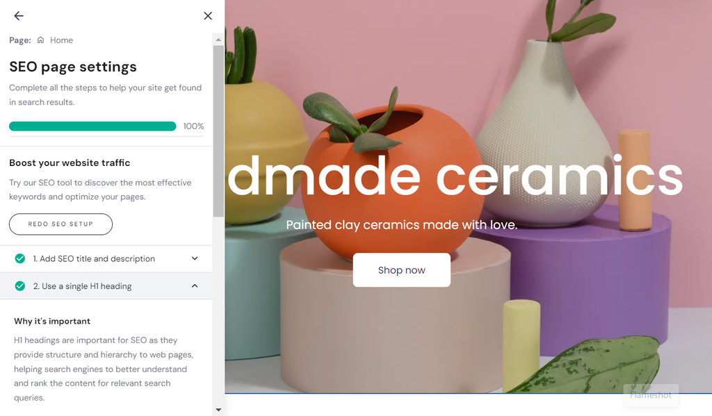 When opening Pages and navigation, you’ll find an on-page SEO checklist. This guide helps you through the optimization process and shows how much you’ve already accomplished.