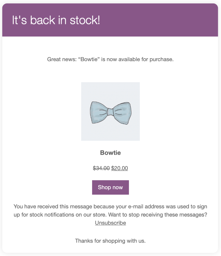 The extension can send bulk back-in-stock alerts with the Action Scheduler integration. To ensure transparency and enhance customer satisfaction, notification emails include an accessible link for unsubscribing.