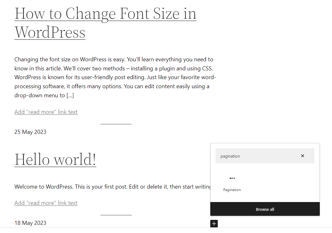 3. If you pick a pattern that doesn’t have pagination, you can add it manually. Click the plus Add Block button at the bottom right of the query loop block and select Pagination.