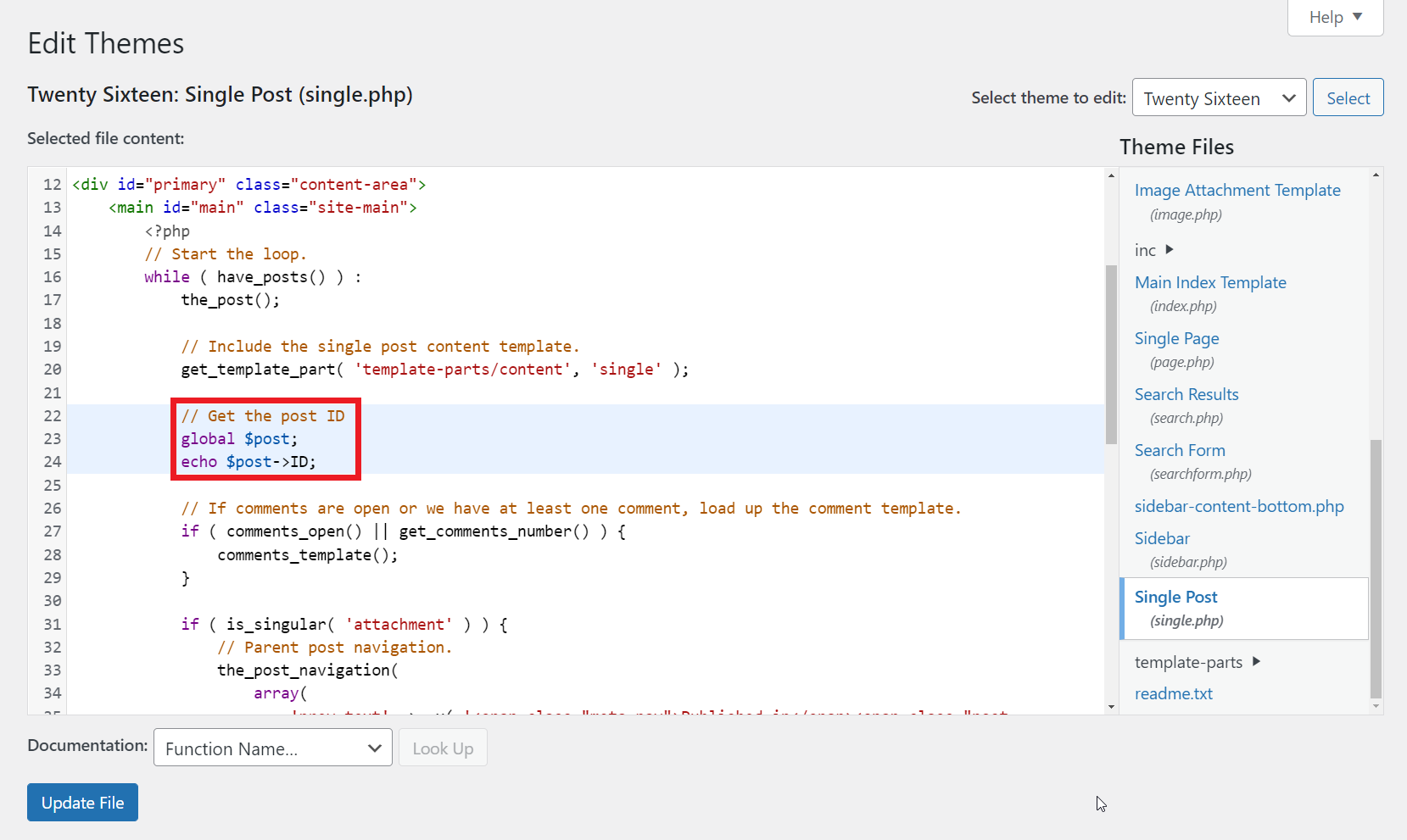 We recommend backing up your WordPress site before testing these functions. We will show you how to use the get_the_ID() function:
