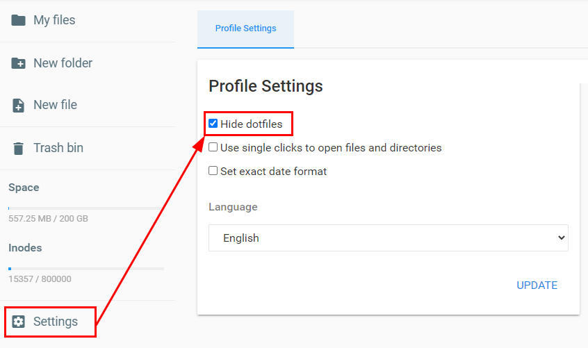 Файли з крапкою на початку – це приховані файли; однак за замовчуванням вони видимі у файловому менеджері. Якщо Ви не бачите файл .htaccess, перейдіть до розділу “Налаштування” у файловому менеджері та зніміть прапорець з опції “Сховати дотфайли”: