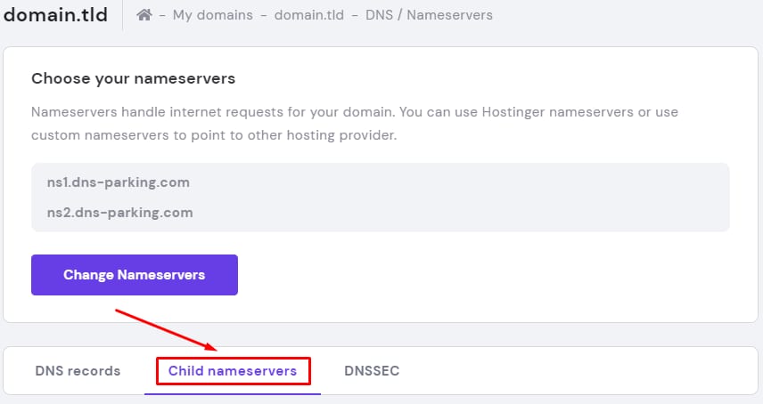 Ви можете керувати своїми DNS-записами за допомогою редактора DNS-зон. Щоб додати нові записи дочірніх серверів імен, відкрийте вкладку “Домени”, виберіть домен, для якого Ви хочете застосувати зміни, і перейдіть на сторінку “DNS / Сервери імен”: