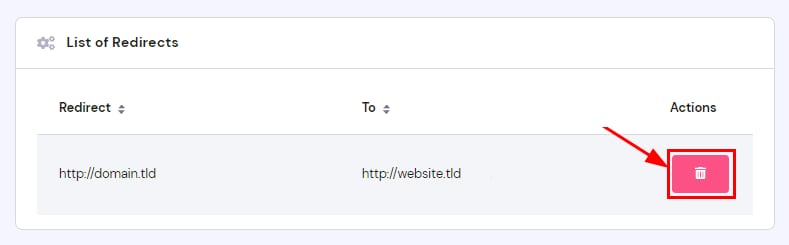 Знайдіть потрібне перенаправлення в розділі “Список перенаправлень”. Натисніть на іконку кошика, щоб видалити перенаправлення: