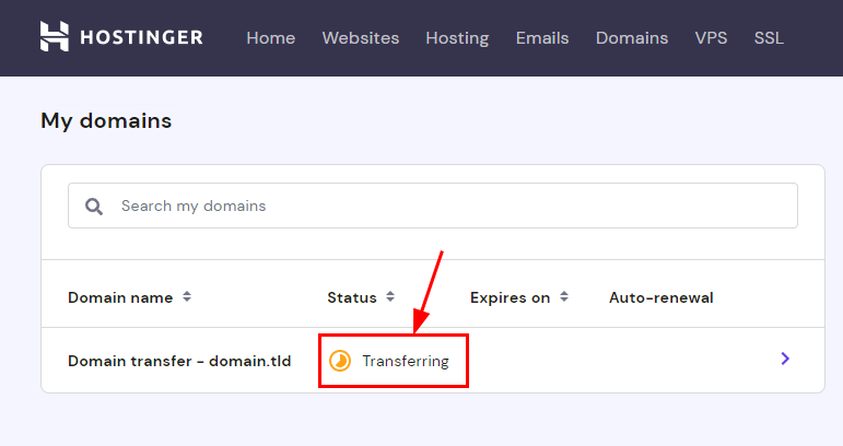 Перенесення домену в Hostinger може тривати 5-7 днів. Під час цього процесу Ви можете перевірити статус, відкривши розділ Домени у панелі управління: