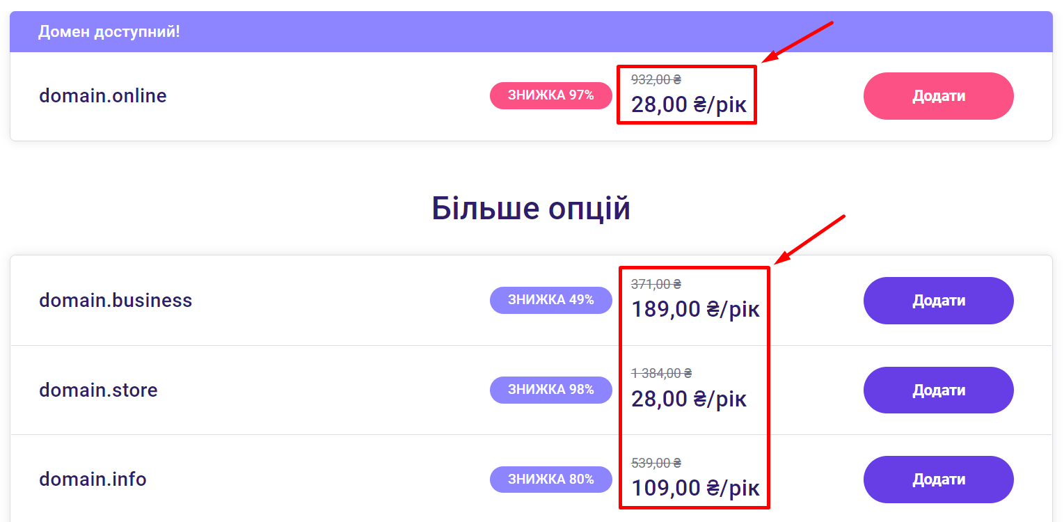 Усі доступні домени та ціни зручно переглянути тут: пошук і реєстрація доменних імен. Просто введіть бажаний домен та натисніть Пошук. Ви побачите кілька варіантів і вартість кожного: