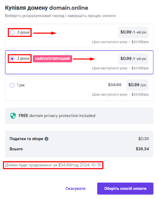 Крім того, деякі домени верхнього рівня можна придбати більше ніж на один рік. Ви отримаєте кращу пропозицію, якщо виберете довший термін!