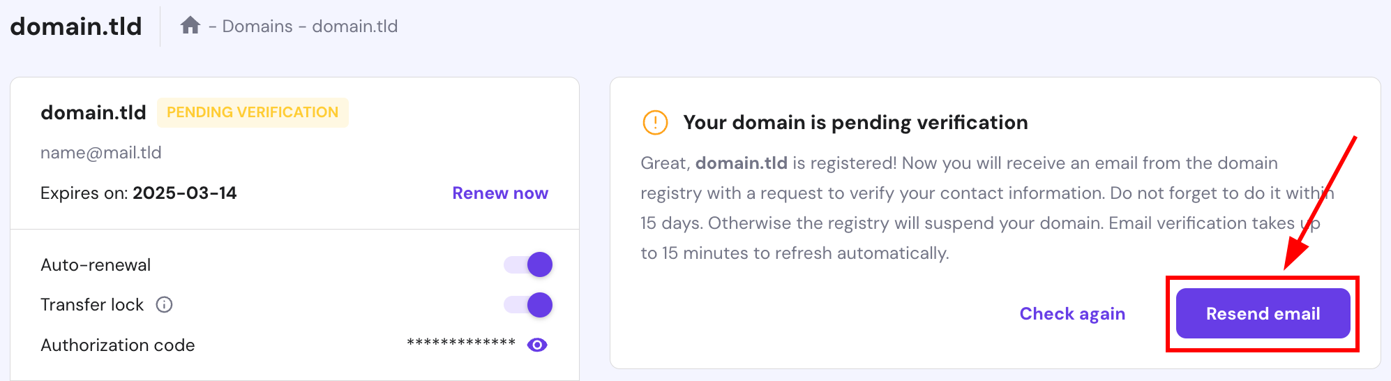 Деякі TLD не вимагають підтвердження домену. У такому разі Ви не отримаєте листа для підтвердження або не побачите пропозицію повторного надсилання листа 💡