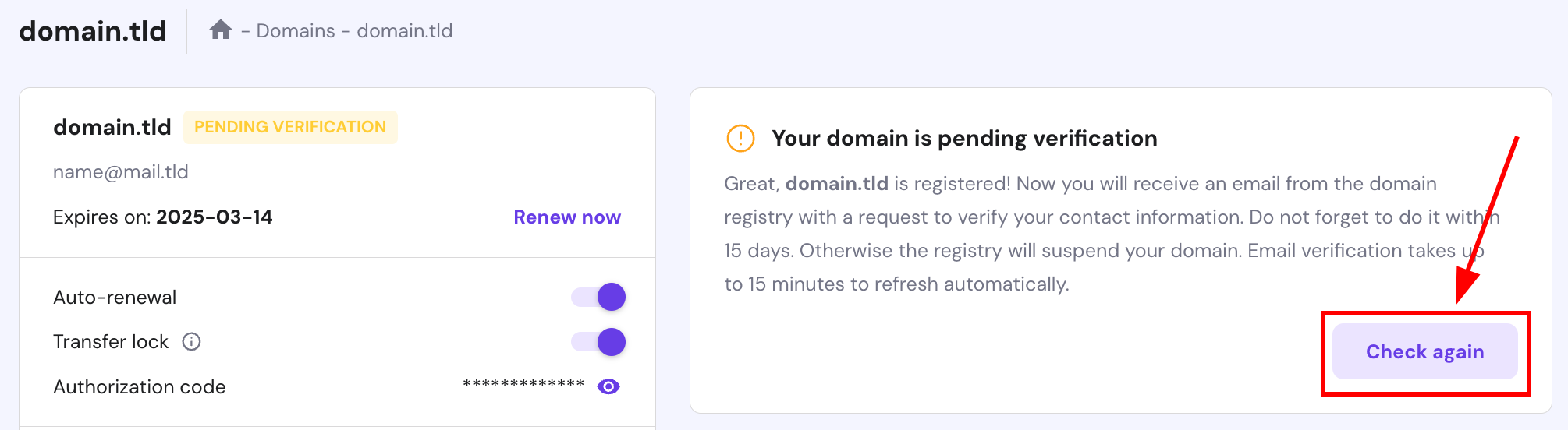 Після реєстрації нового домену на адресу електронної пошти, вказану в контактних даних власника домену, надсилається повідомлення для підтвердження від Hostinger Domains.