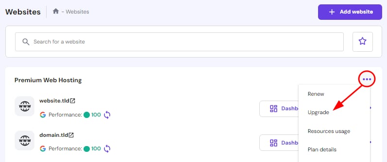 У своєму акаунті Hostinger перейдіть до розділу “Сайти”, натисніть на кнопку (⋯) поруч із сайтом і виберіть “Змінити тариф”: