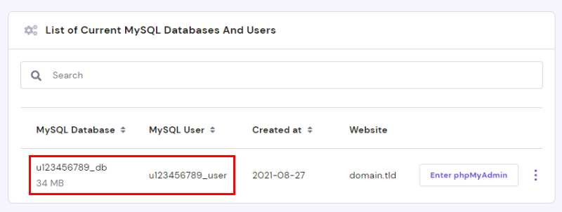 Прокрутіть вниз до потрібної бази даних і Ви побачите деталі у стовпцях “База даних MySQL” і “Користувач MySQL”. Зокрема, Ви знайдете інформацію про її розмір: