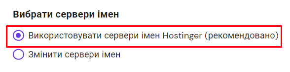 Якщо Ви хочете, аби Ваш домен вказував на Hostinger через сервери імен, просто виберіть опцію «Використовувати сервери імен Hostinger (рекомендовано)»: