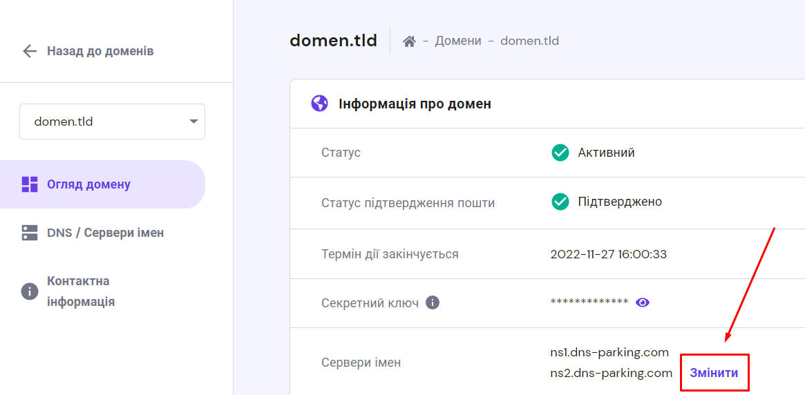 Після цього натисніть на кнопку “Змінити” поруч з серверами імен: