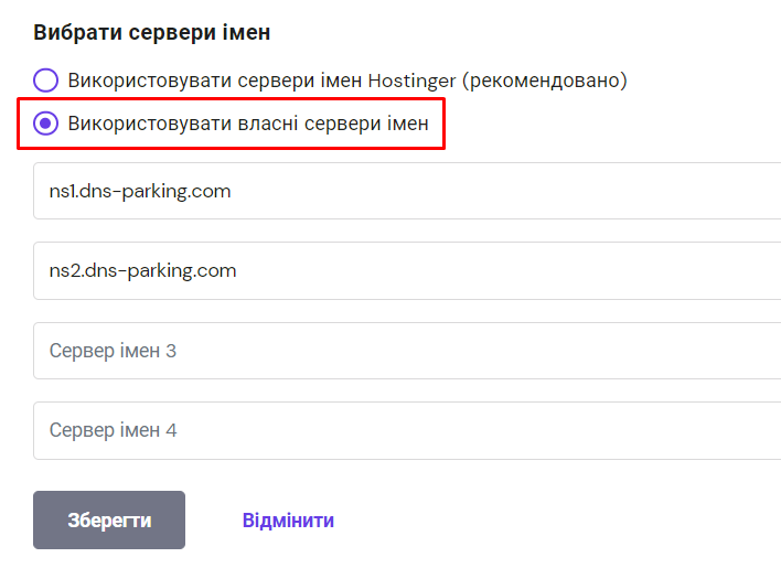 Якщо Ви бажаєте використовувати зовнішні сервери імен, натисніть «Використовувати власні сервери імен» і введіть необхідні значення: