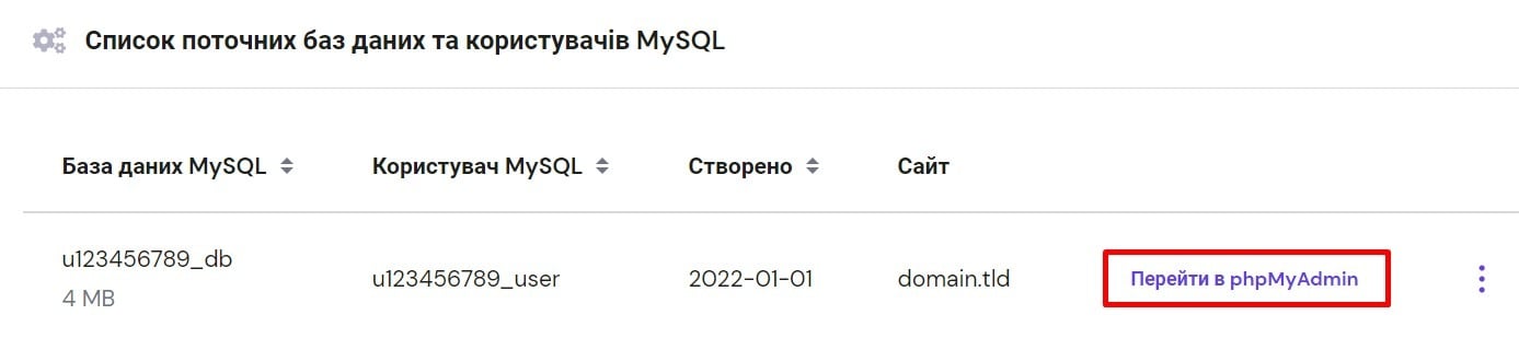 Щоб отримати доступ до вмісту бази даних через phpMyAdmin, натисніть “Перейти в phpMyAdmin”: