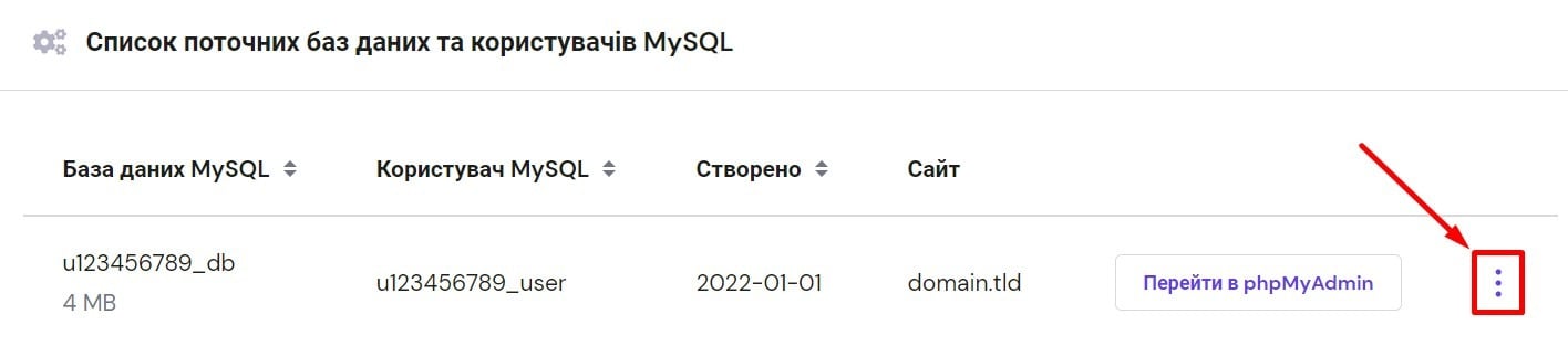 Якщо Вам потрібні додаткові опції, виберіть потрібну базу даних і натисніть на кнопку ⋮ поряд: