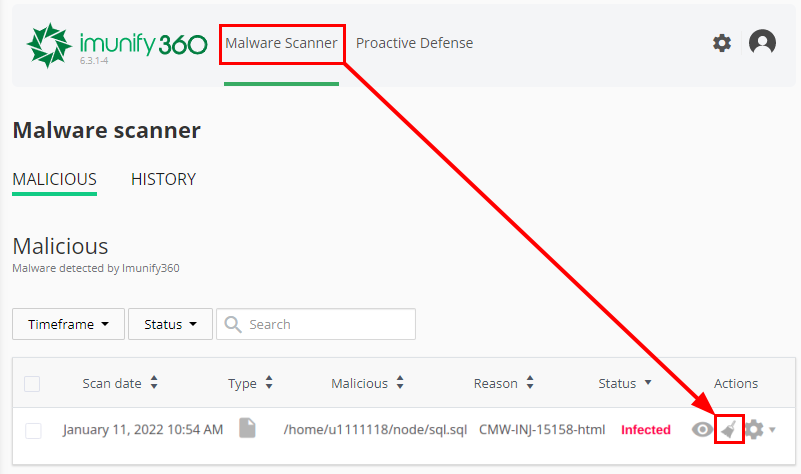 Якщо підозрілий файл виявлено, але його не видалено автоматично, перейдіть на вкладку “Сканер шкідливих програм” і видаліть шкідливий файл, натиснувши на значок мітли в секції “Дії”: