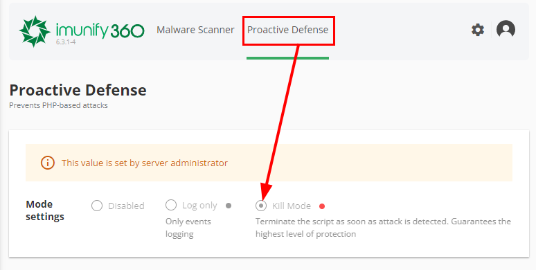 За замовчуванням у програмному забезпеченні Proactive Defense Imunify360 увімкнено режим знищення, який може миттєво зупинити шкідливі скрипти та запобігти їхньому поширенню.