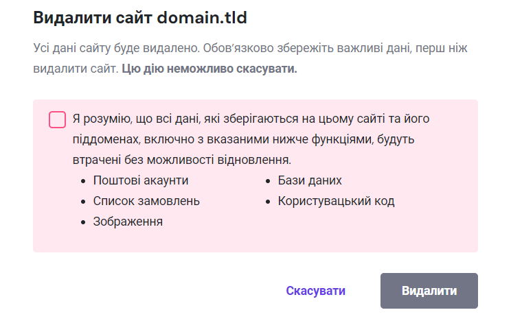 Підтвердьте дію, встановивши прапорець і натиснувши на кнопку “Видалити”. Ваш сайт буде видалено з хостинг разом з усіма його даними.
