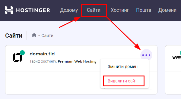 Перейдіть до розділу “Сайти”, знайдіть сайт, який потрібно видалити, натисніть кнопку … і виберіть “Видалити сайт”: