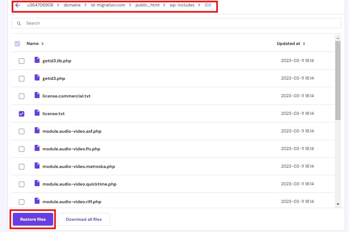 Щоб відновити лише один домен і його піддомени, відкрийте папку “domains”, виберіть папку потрібного сайту (наприклад, domain.tld) і натисніть “Відновити файли”: