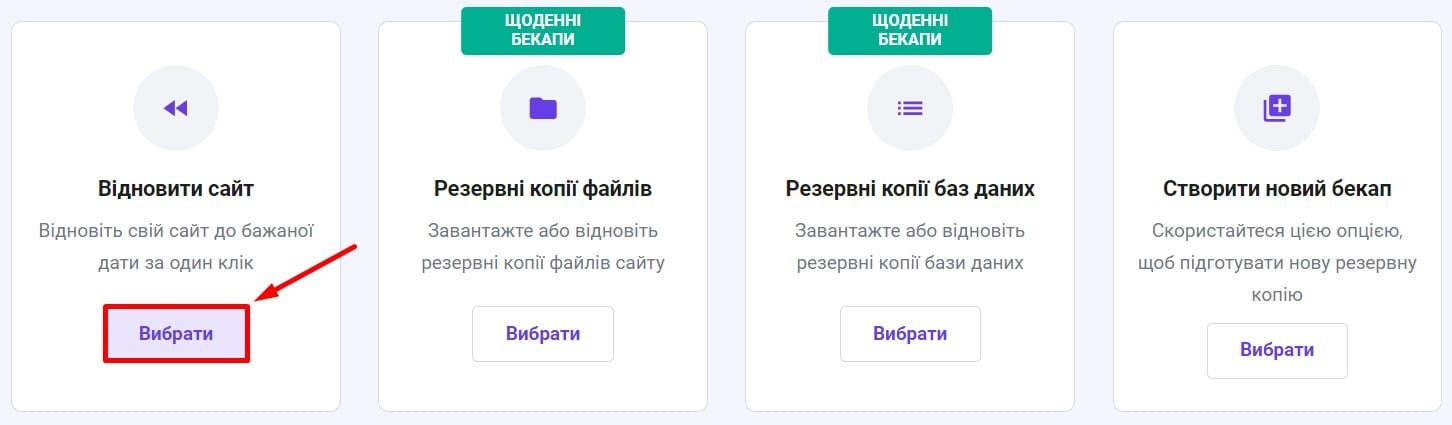 Ви знайдете варіанти резервного копіювання файлів і баз даних Вашого сайту. Настав час обрати найкращий спосіб відновлення бекапів. Ознайомтеся з наведеними нижче поясненнями, щоб зрозуміти відмінності між кожним методом та отримати детальні інструкції 👇