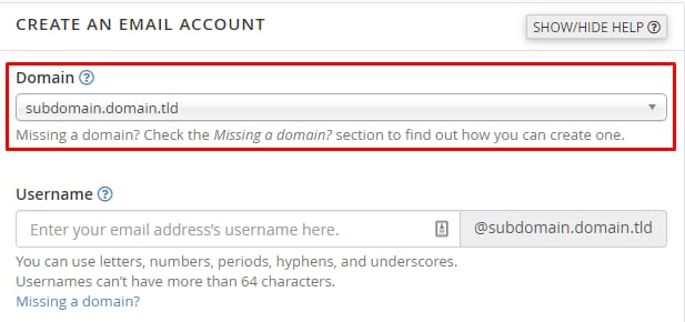 Якщо Ви хочете створити обліковий запис для піддомену, просто виберіть його зі списку (спочатку потрібно створити піддомен):