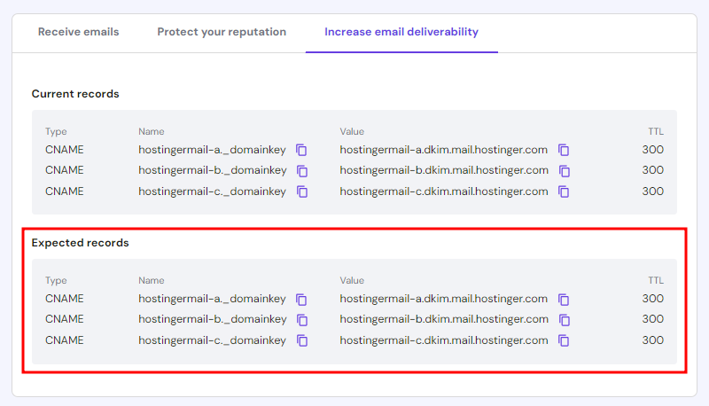 Якщо Ви використовуєте пошту Hostinger зі своїм доменом, DKIM-записи за замовчуванням виглядатимуть приблизно так: