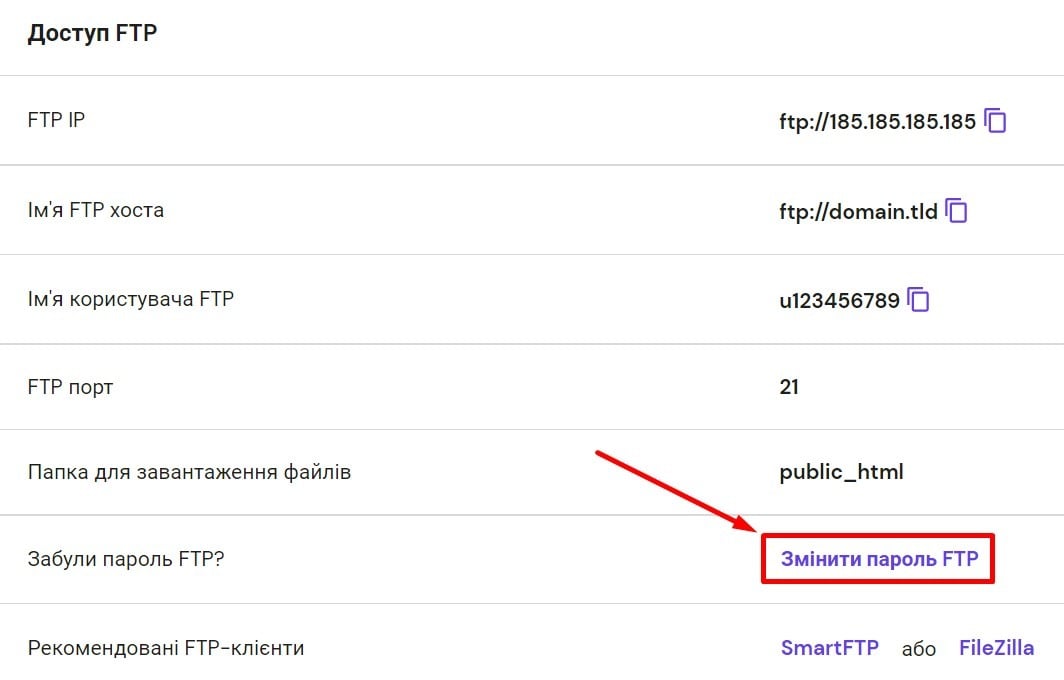 Якщо у Вас виникнуть помилки під час підключення до FTP або SSH, можливо, доведеться змінити пароль. Якщо Ви вперше налаштовуєте обліковий запис, то зверніть увагу, що пароль FTP для основного домену та пароль SSH, однакові.