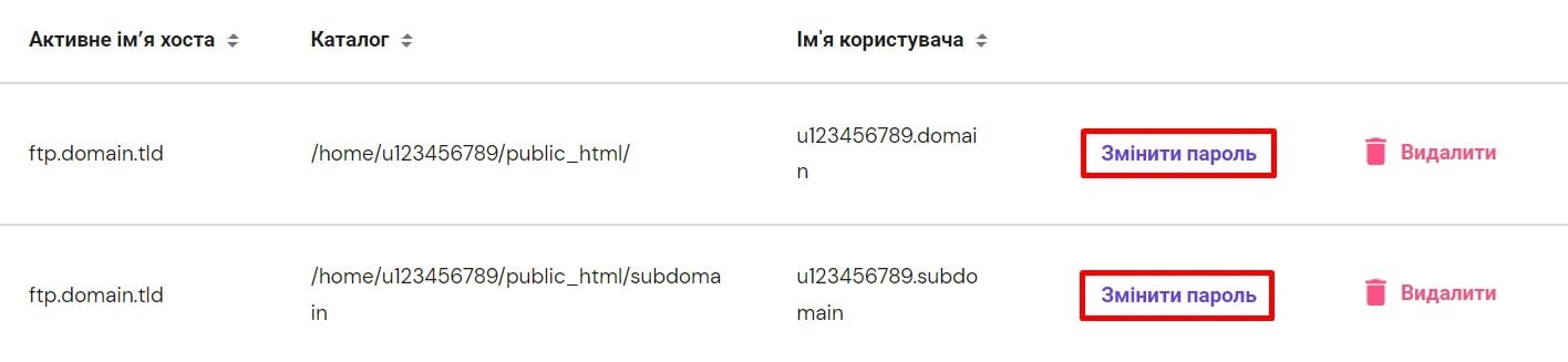 Якщо Ви створили додатковий акаунт FTP, пароль для такого облікового запису можна змінити на тій же сторінці. Прокрутіть униз, знайдіть відповідний акаунт FTP і натисніть “Змінити пароль”: