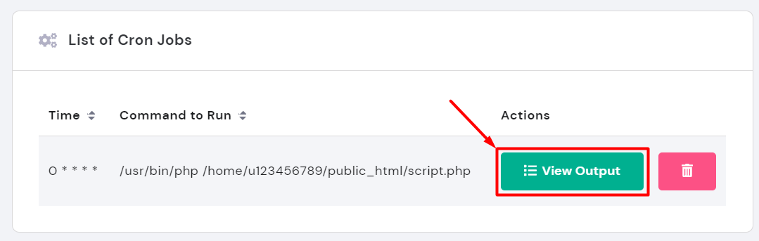 Після того, як Ви налаштуєте задачі Cron у панелі управління hPanel, Ви побачите його у розділі “Список задач Cron”. Щоб переглянути результат, зачекайте, поки завдання буде виконано (за встановленим Вами розкладом), і натисніть кнопку “Переглянути результат”: