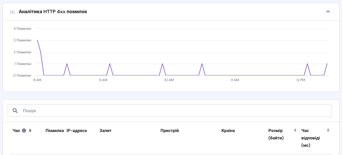 У цьому розділі Ви побачите всі помилки 4xx, згенеровані за вибраний період із детальним описом, щоб точно визначити першопричину: