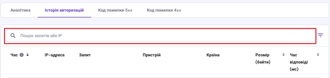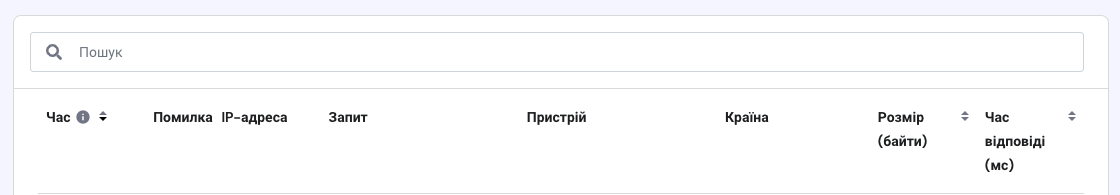 Тут Ви можете дізнатися про HTTP-запити, які автоматично реєструються сервером. Цей розділ містить рядок для пошуку конкретних запитів або IP-адрес, а також повну статистику про кожне відвідування Вашого сайту: