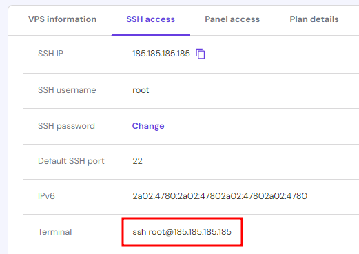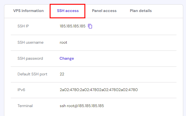 На сторінці “Огляд” перейдіть на вкладку “Доступ до VPS”, щоб знайти дані для підключення до Вашого облікового запису через SSH: