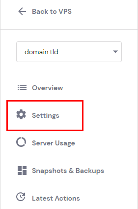 Щоб увімкнути його, перейдіть до розділу “VPS” у панелі управління hPanel і виберіть сервер. Далі відкрийте сторінку “Налаштування”: