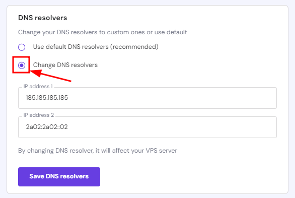Хоча це не рекомендується, Ви все одно можете використовувати власні DNS-резолвери. Перейдіть до розділу “VPS” і виберіть сервер: