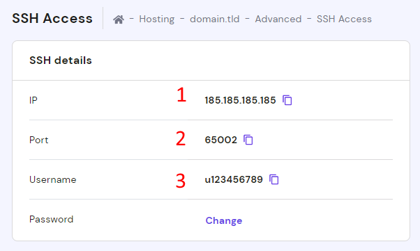 Пароль SFTP/SSH збігається з паролем FTP Вашого основного домену. Якщо Ви не пам’ятаєте пароль, встановіть новий пароль як для FTP, так і для SSH або створіть пароль тільки для SSH.