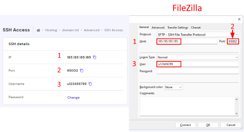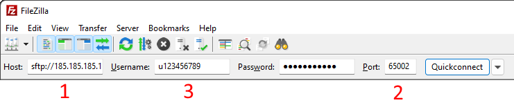 Відкрийте FileZilla і введіть у розділі “Швидке підключення” дані, які можна знайти у розділі “SSH-доступ”:
