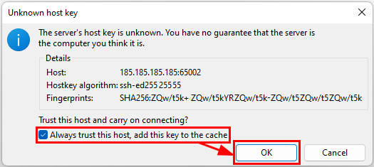 Якщо Ви побачите повідомлення з ключем невідомого хоста, встановіть прапорець біля “Завжди довіряти цьому хосту” і натисніть “OK”:
