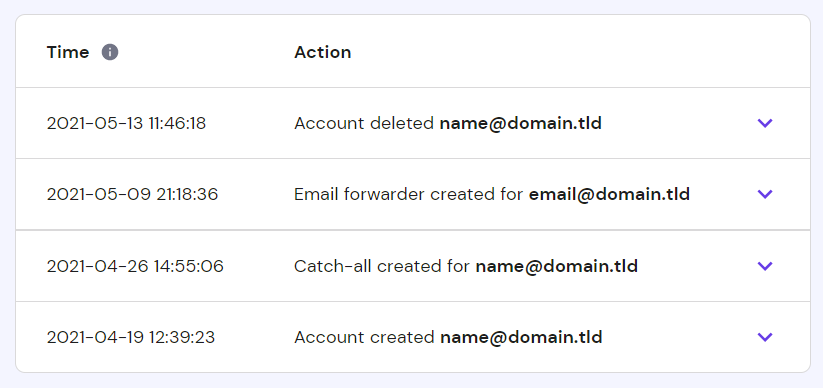 За допомогою функції “Історія дій” Ви можете легко перевірити дії, які виконувалися у Ваших акаунтах пошти Hostinger (наприклад, створення нових облікових записів або переадресацій пошти), і коли саме це відбулося.