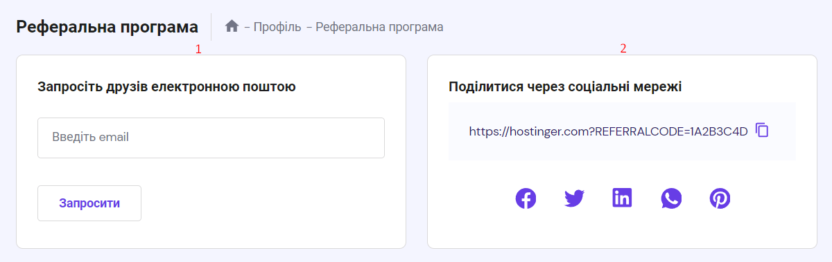 Якщо Ви хочете запросити лише кількох друзів, аби вони скористалися послугами Hostinger, тоді наша реферальна програма ідеально підходить для цього. Ви отримаєте додатковий дохід, а Ваші друзі знижку при оформленні замовлення.